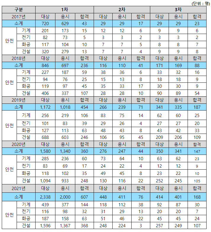 위의 합격률을 보면 아시겠지만 1차 시험도 합격률이 상당히 낮은 편입니다. 가장 최근 이었던 2021년의 경우 30%에 턱걸이를 하였고 2020년은 26% 밖에 되지 않았습니다. 아무래도 응시자격에 제한은 없지만, 1차나 2차 시험의 경우 기사시험 이상의 난이도를 가지고 있다고 생각을 해야 할 것 같습니다. 그리고 안전관련 자격증 중에서는 상위 자격증이기 때문에 결코 난이도가 쉽다고는 할 수 없을 것 같습니다.